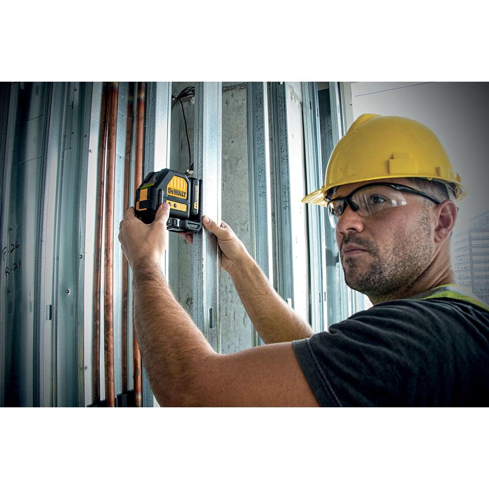 Линейный лазер DCE088D1G предназначен для проецирования лазерных линий при выполнении профессиональных работ. Данный прибор может использоваться для горизонтального (уровневого) и вертикального (отвесного) выравнивания внутри и вне помещений. Прибор проецирует 1 горизонтальную и 1 вертикальную линии зеленого цвета. 2 различные последовательности мигания луча в ручном режиме (без выставления по уровню). Постоянный импульсный режим: позволяет использовать прибор с детектором. Прочная конструкция: прорезиненный корпус и класс защиты IP65 от воды, пыли и строительного мусора, выдерживает падения с высоты 2 м. Блокировка маятника: для предотвращения повреждения внутренних компонентов при транспортировке. Магнитное поворотное основание (кронштейн) с отверстиями с резьбой 1/4” и 5/8” позволяет крепить прибор к металлическим конструкциям или устанавливать на треногу. Нивелир способен работать от аккумулятора или батареек типа АА (с помощью фирменного адаптера).