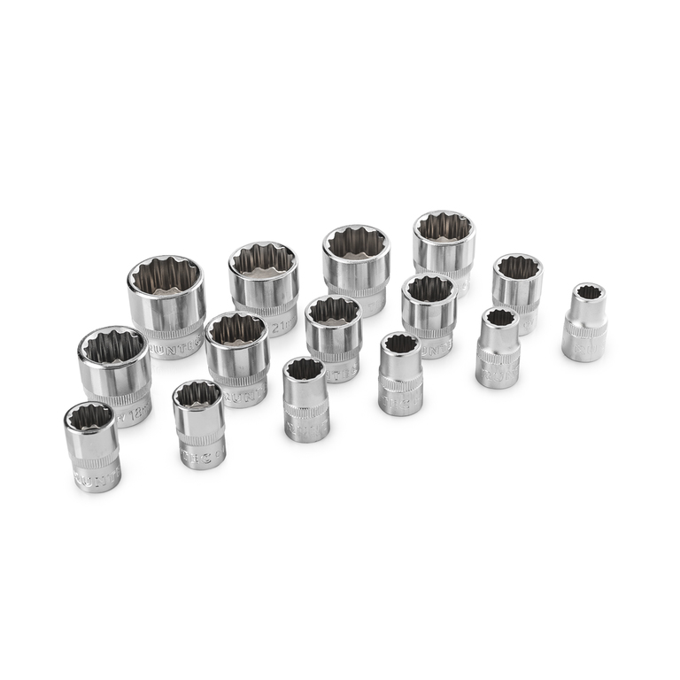 Набор включает в себя широкий диапазон размеров торцевых головок из 15 предметов, а также магнитную свечную головку 14 мм.