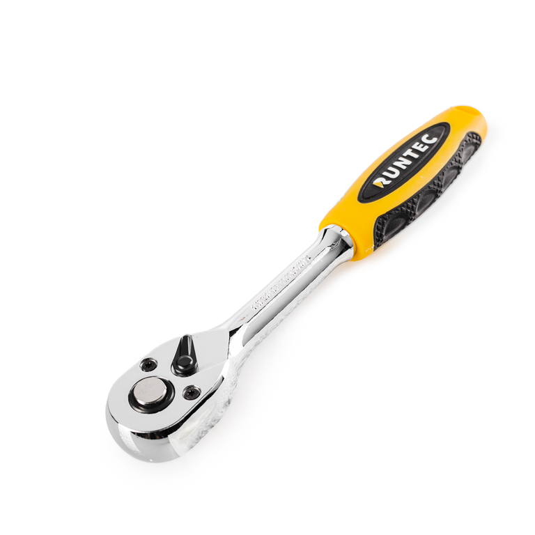 Трещотка оснащена надежным 72-зубцовым храповым механизмом, снижающим минимальный угол поворота до 5º, а также трехкомпонентной маслобензостойкой ручкой для удобного и надежного захвата.
