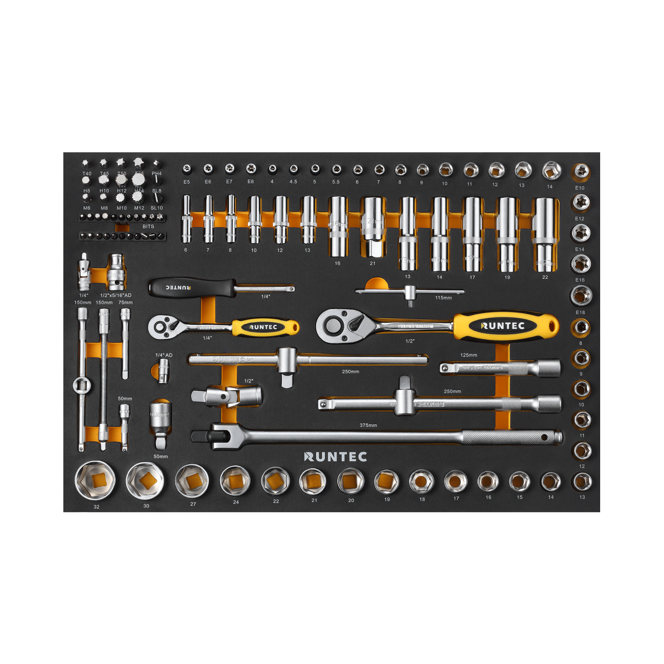 RT-HT1E110 | Набор торцевых головок с аксессуарами RUNTEC 1/2", 1/4" в ложементе EVA, 110 предметов, 570x375x40 мм | |