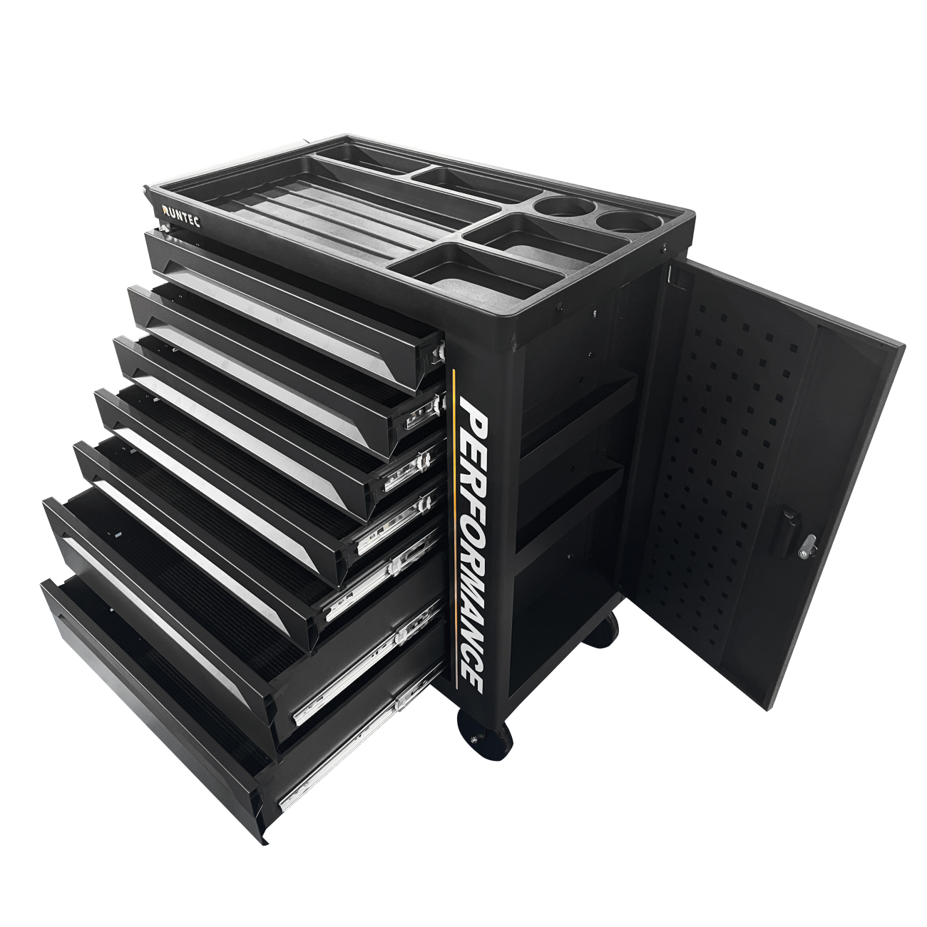Инструментальная тележка RUNTEC PERFORMANCE с 7 выдвижными полками является идеальным решением для специалистов автосервисов. Набор из 273 предметов располагается в ложементах, которые идеально помещаются на полках. Столешница тележки изготовлена из износостойкого ABS пластика с расположенными на ней пластиковыми отделениями для инструмента или оснастки. Порошковая окраска защищает от коррозии и механических повреждений.