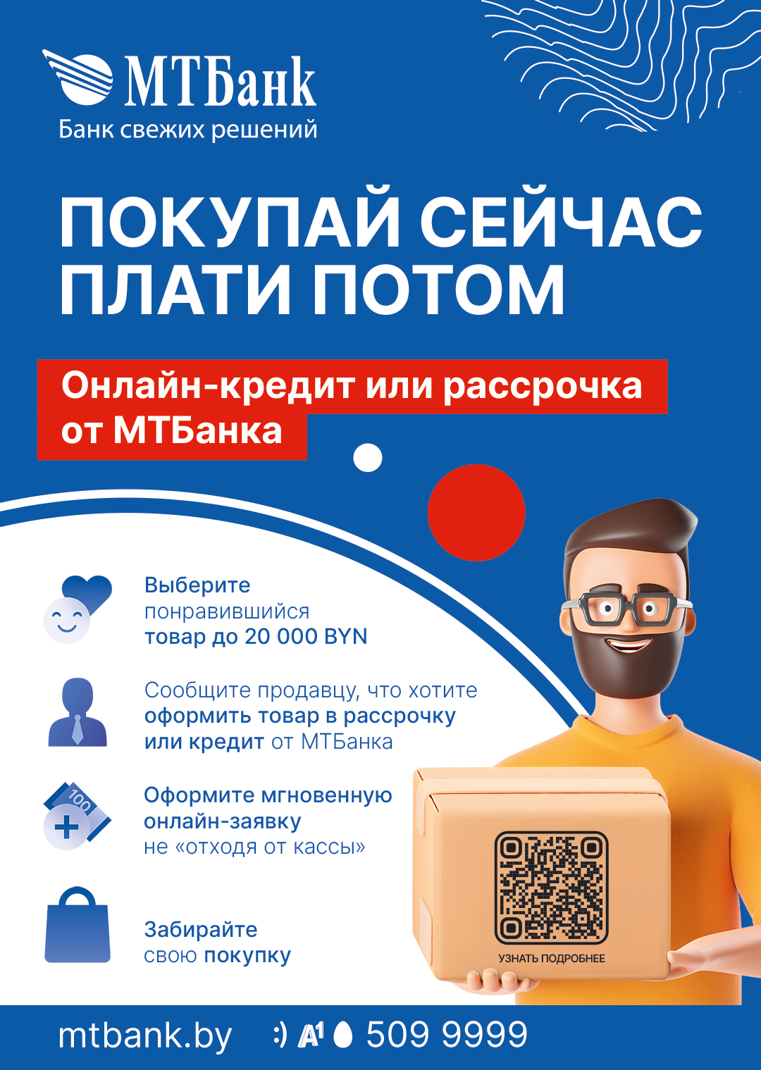 Все подробности оформления рассрочки или онлайн-кредита на mtbank.by, по тел. 509 99 99 (любой мобильный оператор) или в отделениях МТБанка для физических лиц.